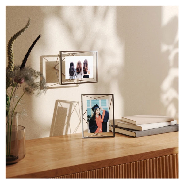 Dodatni opis: Prisma je savremeni i jedinstveni geometrijski ram za fotografije. Fotografija se postavlja između dva čvrsta stakla ram stvara efekat plutanja i dodaje stepen dimenzije i dubine. Prisma se može orijentisati u mnoštvu aranžmana uključujući viseće ili sedeće vertikalno ili horizontalno i postaviti na sto ili montirati na zid.Prismini ramovi za fotografije su geometrijskog oblika dekorativni i funkcionalni dodajući dimenziju ravnom prikazu slike što ih čini modernim. Dizajn plutajuće slike čini Prismine ramove inovativnim. Dizajn lebdi vašu fotografiju između dva stakla dok omogućava da se geometrijski ram vidi kroz Ovaj jedinstveni ram iz Umbre dolazi u različitim veličinama i atraktivnim završnim obradama koje će upotpuniti svaki dekor