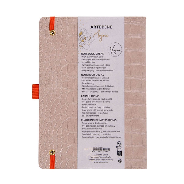 Dodatni opis: Otkrijte radost pisanja uz našu elegantnu svesku MAJOIE. Ovaj elegantni dodatak u mirnoj boji peska sa svojom veganskom mekom površinom u izgledu krokodilske kože kombinuje stil sa ekološkom svešću. Svaki put kada ga uzmete u ruke možete osetiti brigu sa kojom je napravljen. Sveska ostaje zatvorena sve vreme zahvaljujući traku za zatvaranje u kontrastnoj boji čime vaše beleške ostaju bezbedne i privatne. Jednom otvorene stranice visokog kvaliteta leže glatko i spremne za vaše misli. Stranice su dizajnirane da spreče prikazivanje vaših unosa. Takođe ima mesta za vašu omiljenu olovku jer praktični detalj sa strane čuva je i drži uvek na dohvat ruke. Takođe možete da čuvate male beleške ili ljubavna pisma u dodatnom džepu organizatora na zadnjoj strani korice knjige. Učinite ovu svesku vašim mestom za kreativnost i razmišljanje.