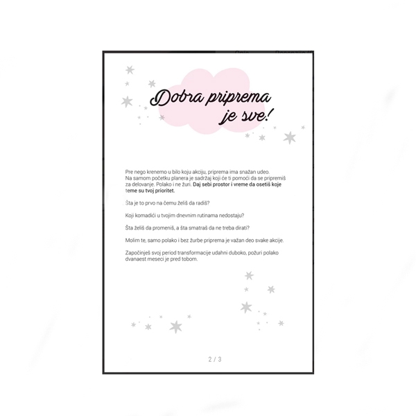 Dodatni opis: Još jedan u nizu planera misliš se.. Ipak Planer za red je sve sem običnog planera. Iako možda liči i podseća na one planere u koje upisujete svoje obaveze Planer za red je moćno i jedinstveno sredstvo na vašem putu do cilja. Prateći prirodan ciklus od 9 meseci koliko i bebi treba da se razvije ali i našim idejama i nama samima dajemo dovoljno vremena da sazre porastu i budu prisutne u našim životima. Važno je samo biti rešen. Spremnost će doći vremenom. Ono što je najbolje je što je sistem u potpunosti fleksibilan podređuje se ličnom ritmu i vremenu. Kroz seriju pitanja malo crtanja i puno pisanja vremenom ćete osvetliti najskrivenije kutke svoje duše i zagledati duboko u sebe kako bi se povezali sa svojim autentičnim „ja“. Cena važi za 1 planer iz seta Planer za red