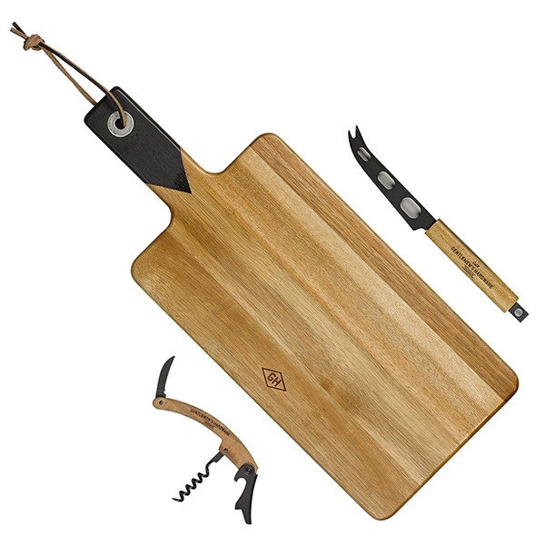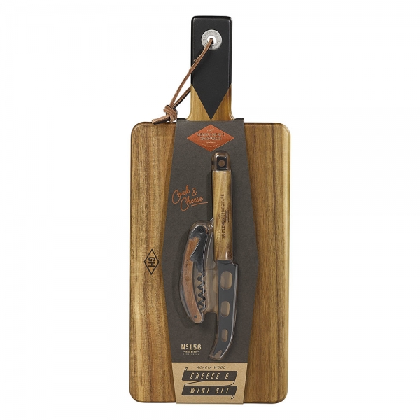 Dodatni opis: Set se sastoji od: daske za serviranje noža za sireve i otvarača vinskih flaša. Ova fantastična daska izrađena je od akacije dragocenog drveta koje pleni svojom lepotom i snagom. Akacija ili bagrem je tvrdo drvo bogato prirodnim uljima koja ga čine otpornim na vodu odnosno sokove koje hrana ispušta. Obojena crna ručka sa kožnom vezicom za kačenje čini ovu dasku još elegantnijom. Otvarač i nož izrađeni su od visoko kvalitetnog nerđajućeg čelika a drška noža je od drveta akacije. Isecite predjelo servirajte na ovoj dasci kojoj je priroda podarila predivne šare otvorite flašu fina i oduševite sve prisutne ovim kvalitetnim i sofisticiranim Setom za sir i vino - Gentlemen s Hardware.