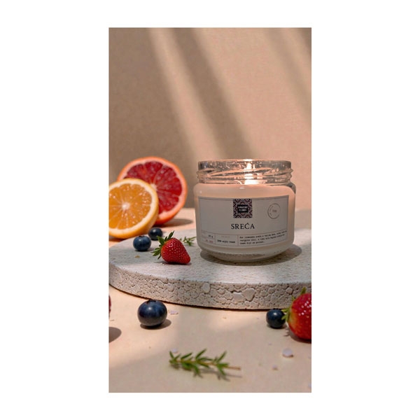 Sreća je baš takva: razigrana svetla i osvežavajuća. Miris: Sočno voće se širi u vazduhu poput prvog gutljaja letnjeg koktela — svetlo slatko i veselo. Tiha nota kupine ostaje u pozadini kao osmeh koji ne prolazi dok ceo miris donosi osećaj topline radosti i laganog uživanja u trenutku. Zašto je posebna: Ova sveća stvara atmosferu bezbrižnosti i optimizma — savršena je za letnje večeri druženja sa prijateljima ili trenutke kada želiš da se podsetiš koliko život može biti lep. Sreća nije samo miris — to je raspoloženje. Tonovi: • Vrh: sočne voćne note (citrusi i zrelo voće) • Srce: slatka kupina • Baza: blagi topli trag koji zaokružuje miris Savršena kao poklon ili kao mali letnji ritual samo za tebe — jer sreća dolazi u jednostavnim trenucima.